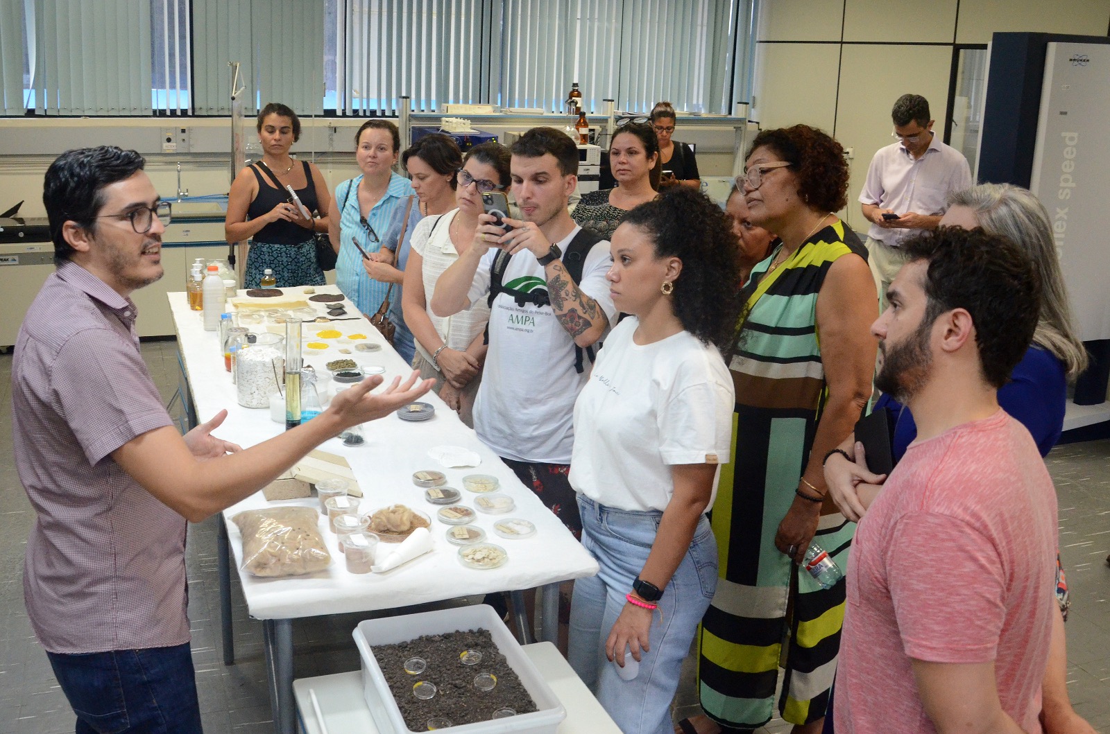 Durante a visita, o grupo teve a oportunidade de conversar com os pesquisadores do CBA e conhecer algumas das pesquisas desenvolvidas nos laboratórios da instituição, a exemplo do trabalho desenvolvido em parceria com o Instituto de Pesquisas Tecnológicas (IPT) e coordenado pela pesquisadora Simone da Silva que trata da elaboração de bioprodutos derivados da fibra do curauá (Ananas erectifolius). As fibras do curauá são resistentes e duráveis, sendo extraídas das folhas da planta e utilizadas para a produção de diversos produtos, como cordas, tecidos, artesanato, papel e até mesmo componentes automotivos e acústico em construções sustentáveis.