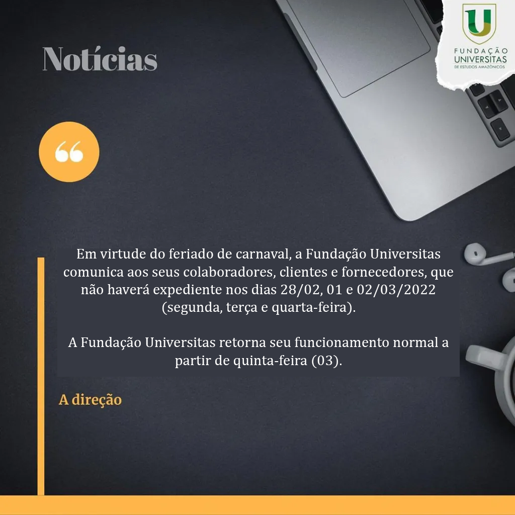 Em virtude do feriado de carnaval, a Fundação Universitas comunica aos seus colaboradores, clientes e fornecedores, que não haverá expediente nos dias 28/02, 01 e 02/03/2022 (segunda, terça e quarta-feira).