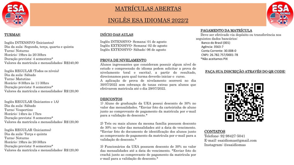 A Esa Idiomas está abrindo vagas para cursos de Inglês com varias turmas para todos os níveis, onde alunos da UEA tem desconto de até 30%!!